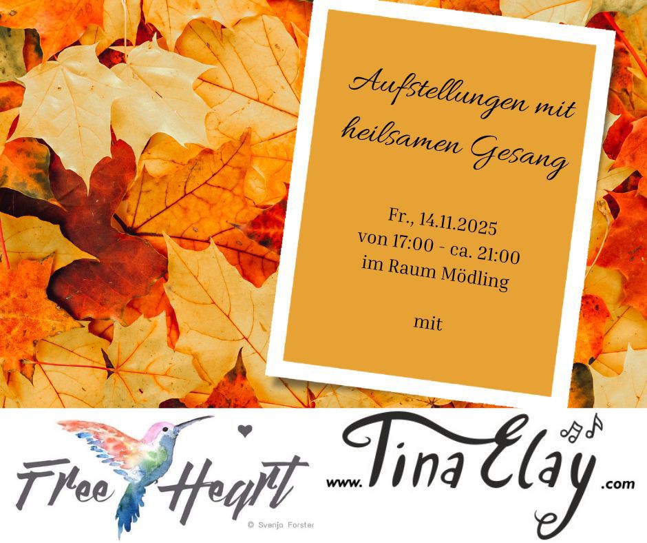 Aufstellungen mit heilsamen Gesang – November 2025 mit Svenja Forster (Aufstellungsleitung) und Tina Elay (Musik, Klänge) Die Aufstellungen mit heilsamen Gesang sind Aufstellungsarbeit, in einer ganz besonderen Form. Eine Verbindung zwischen Musik, Heilarbeit und Aufstellungsarbeit. Mit der heilsamen Unterstützung von Mantren, Healingsongs und Instrumentalklängen wird während der Aufstellung nicht wie klassisch gesprochen sondern vorwiegend gesungen. […]